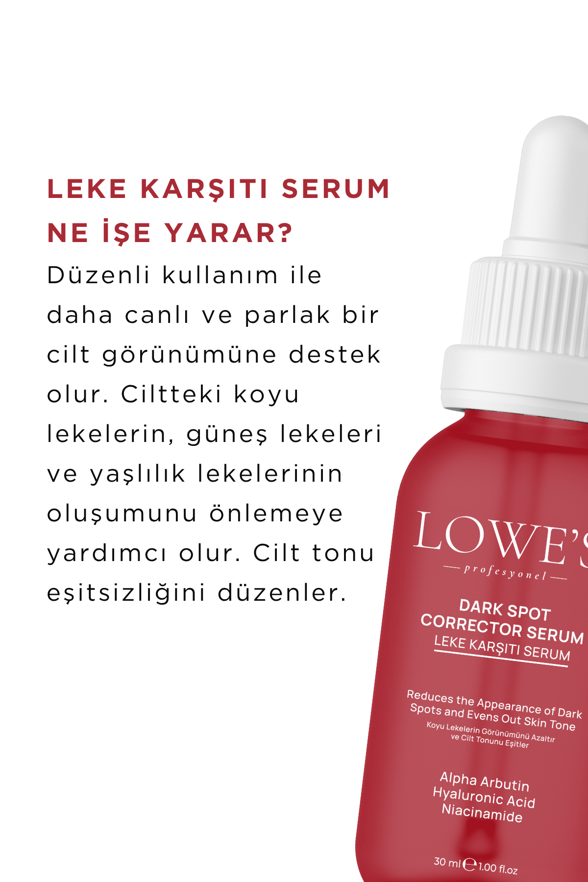 Güneş lekeleri, yaşlanma belirtileri ve cilt tonu eşitizizizliklikleriyle savaşmak için özel olarak formüle edilen Lowes Leke Karşıtıtı Serum, %2 Alpha Arbutin، %2 Hyaluronik Asit و Niacinamide içeriğiyle cildinizin daha aydınlık, pürüzsüzüz ve sağlıklı görünmesini destekler.