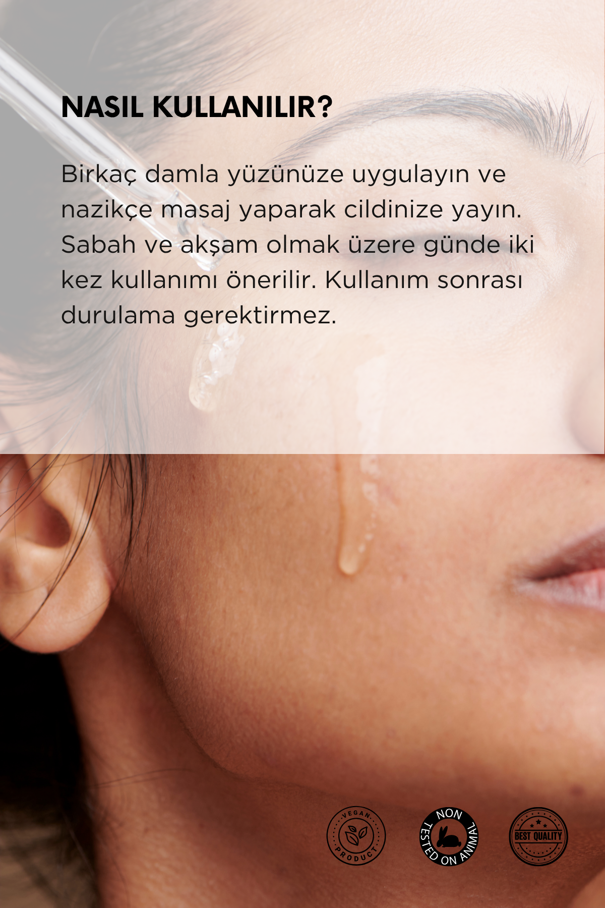 ألفا أربوتين، هيالورونيك أسيت، نياسيناميد، جلوتاتيون، فيتامين سي توريفي (فوسفات أسكوربيل الصوديوم)، بانثينول، توكوفيريل أسيتات (فيتامين هـ)، بيتكيسيل أوزلر ve nemlendiriciler.