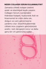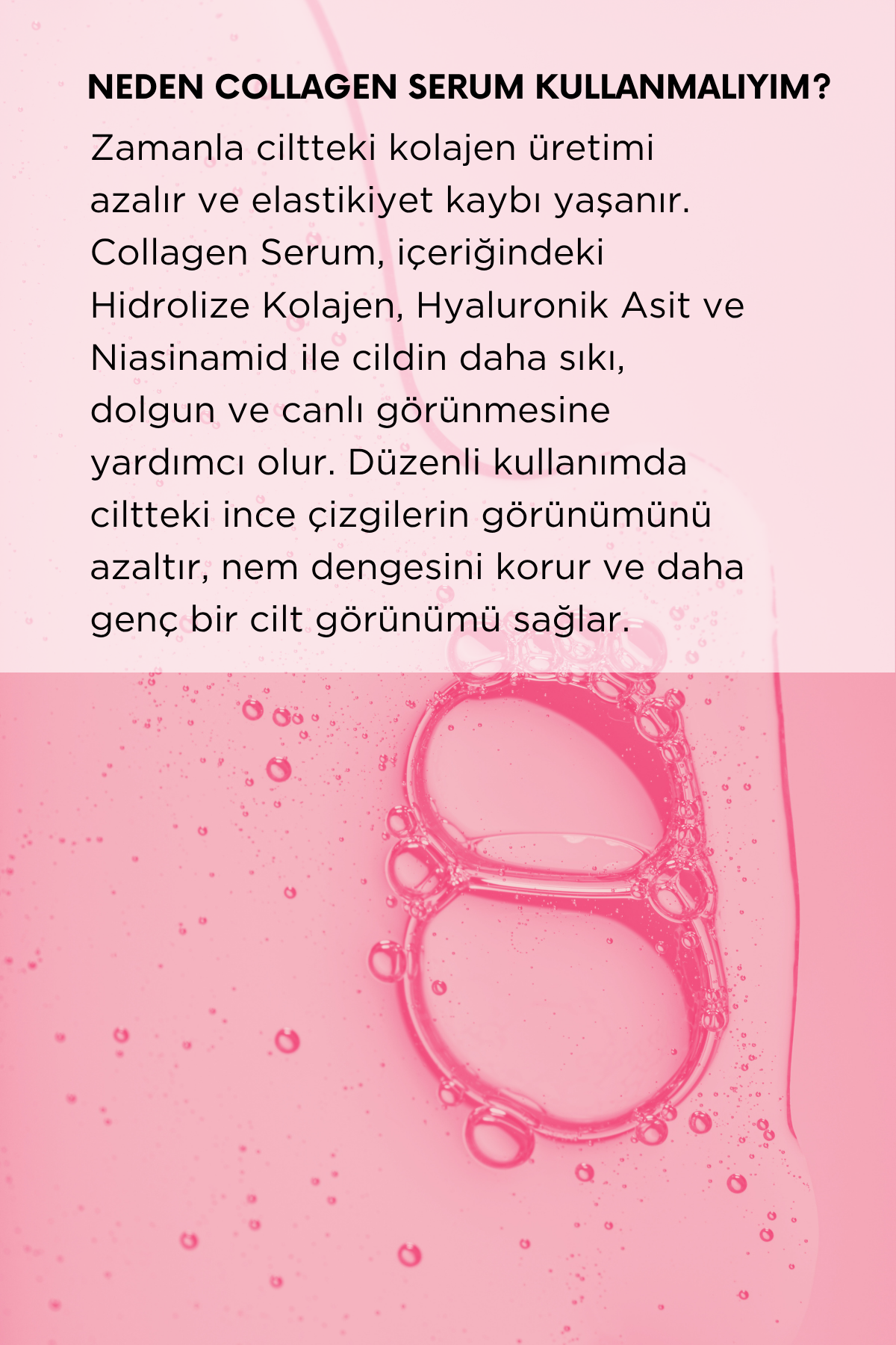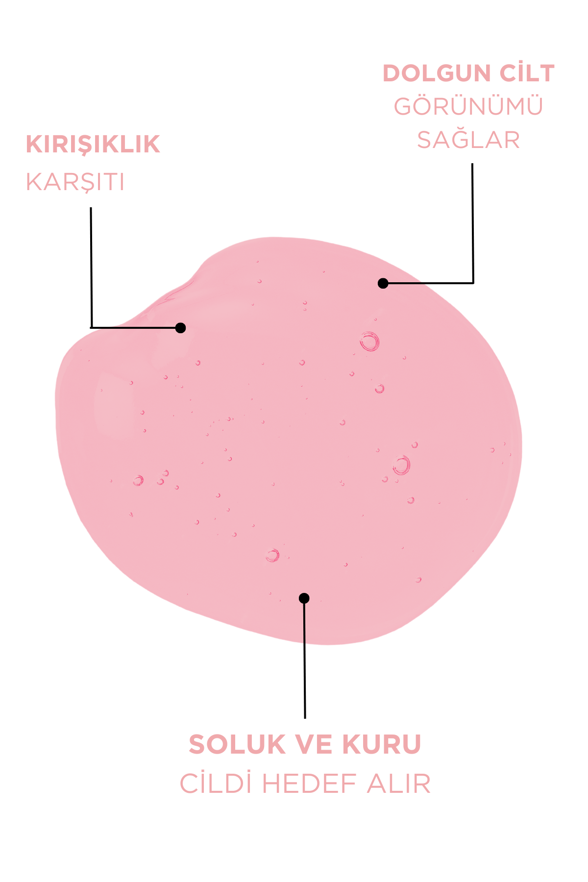Cilt elastikiyetini artırmak, nem dengesini korumak ve daha dolgun bir görünüm kazandırmak için özel olarak geliştirilmiştir. İçeriğindeki Hidrolize Kolajen, Hyaluronik Asit ve Niasinamid sayesinde cilde daha canlı, parlak ve genç bir görünüm kazandırır. Düzenli kullanımda ince çizgilerin görünümünü azaltmaya ve cildin sıkılığını artırmaya yardımcı olur.