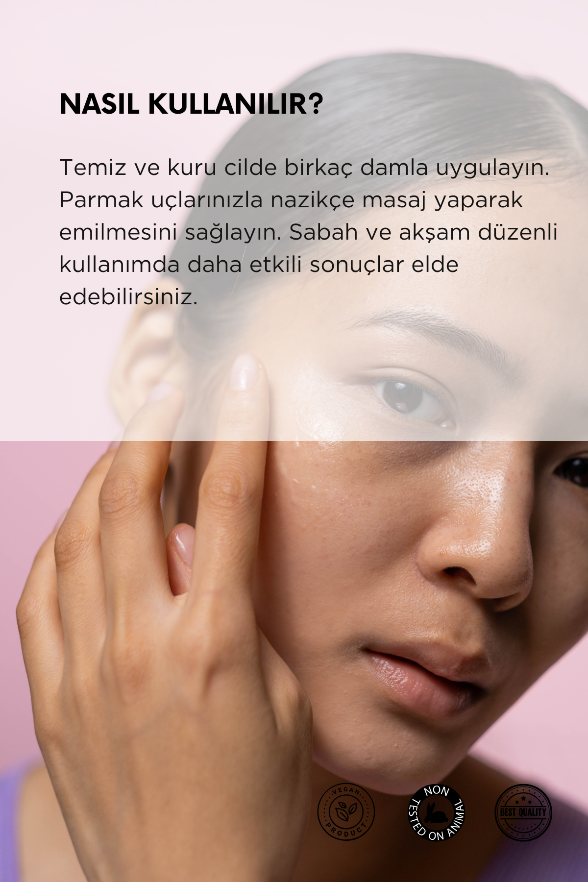 Temiz ve kuru cilde sabah ve akşam olmak üzere günde iki kez birkaç damla uygulanır. Parmak uçlarıyla nazikçe masaj yaparak emilmesi sağlanır.