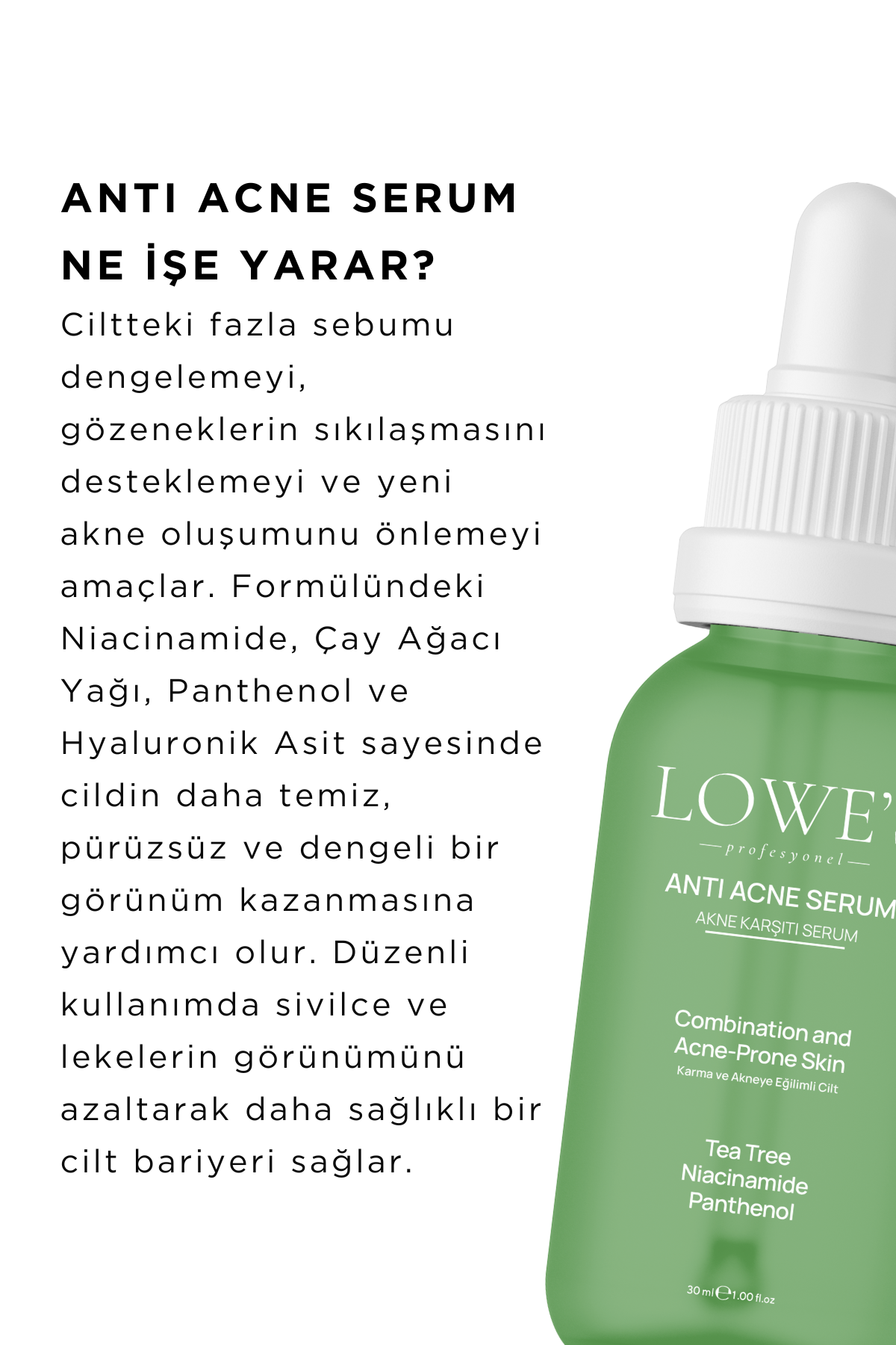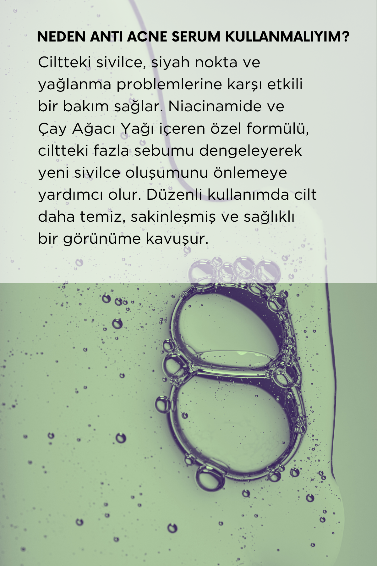 Ciltteki fazla sebumu dengelemeye, gözeneklerin sıkılaşmasına ve yeni akne oluşumunun önlenmesine yardımcı olmak için özel olarak geliştirilmiştir. Formülündeki Niacinamide, Çay Ağacı Yağı, Panthenol ve Hyaluronik Asit, cildin daha temiz, pürüzsüz ve dengeli bir görünüm kazanmasına katkı sağlar. Düzenli kullanımda sivilce ve lekelerin görünümünü azaltmaya yardımcı olur.