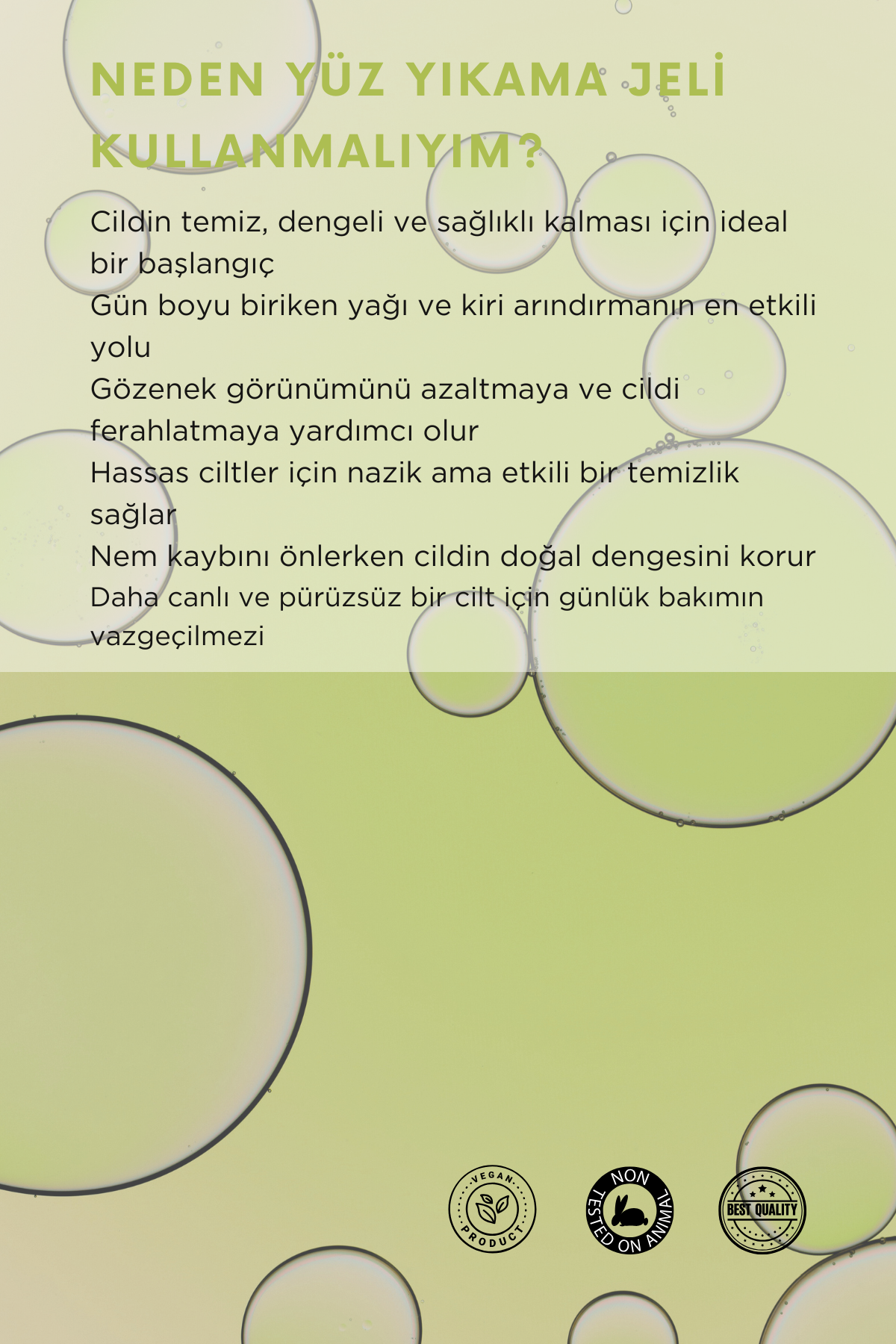 Yağlı ve hassas ciltler için özel olarak geliştirilmiş yüz temizleme jelidir. Cildi nazikçe temizlerken fazla sebumun dengelenmesine yardımcı olur. İçeriğinde bulunan Papatya ve Calendula özleri cildi yatıştırırken, Hyaluronik Asit ve Gliserin cildin nem dengesini korumaya destek olur. Witch Hazel özü gözenek görünümünü sıkılaştırmaya yardımcı olurken, Citric Acid cildin doğal pH dengesini korur. Düzenli kullanımda cilt daha ferah, arınmış ve dengeli bir görünüme kavuşur.